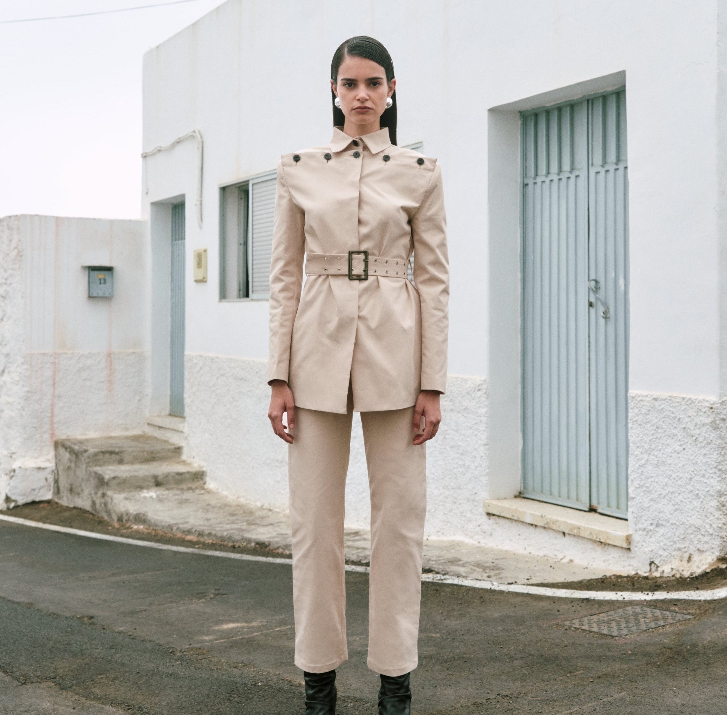 A structured sand-toned jacket inspired by modern military tailoring. Finished with a matching belt that cinches the waist, creating a sharp, elongated silhouette. Paired with coordinating trousers for a clean monochrome look.