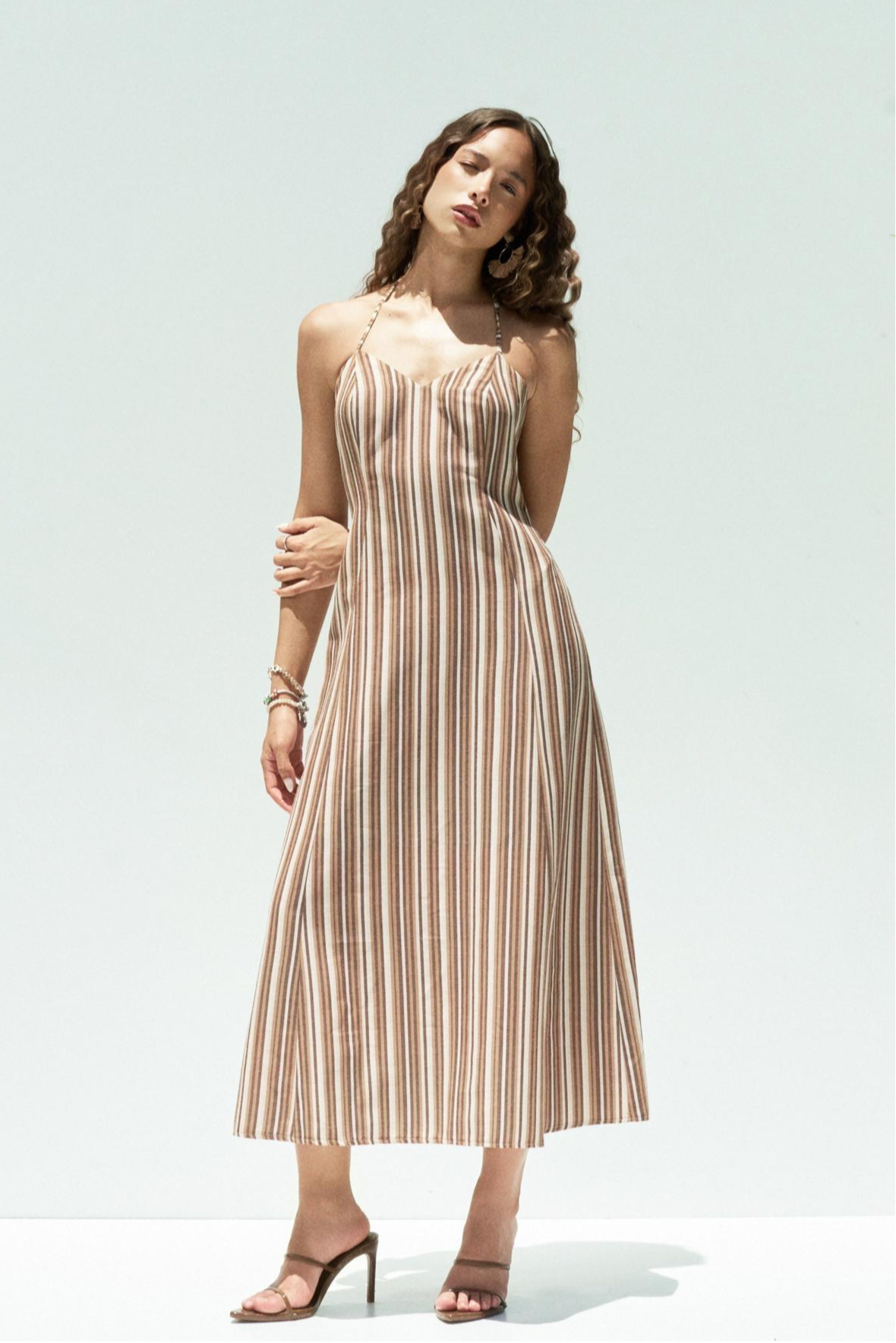 Crafted in earthy, vertical stripes that elongate the silhouette, this two-piece ensemble features an asymmetrical one-shoulder top and a flowing dress. Designed for versatility and impact, the top ties at the side for a custom fit, while the dress moves fluidly with every step. Wear it as a set or mix and match for endless styling options.
