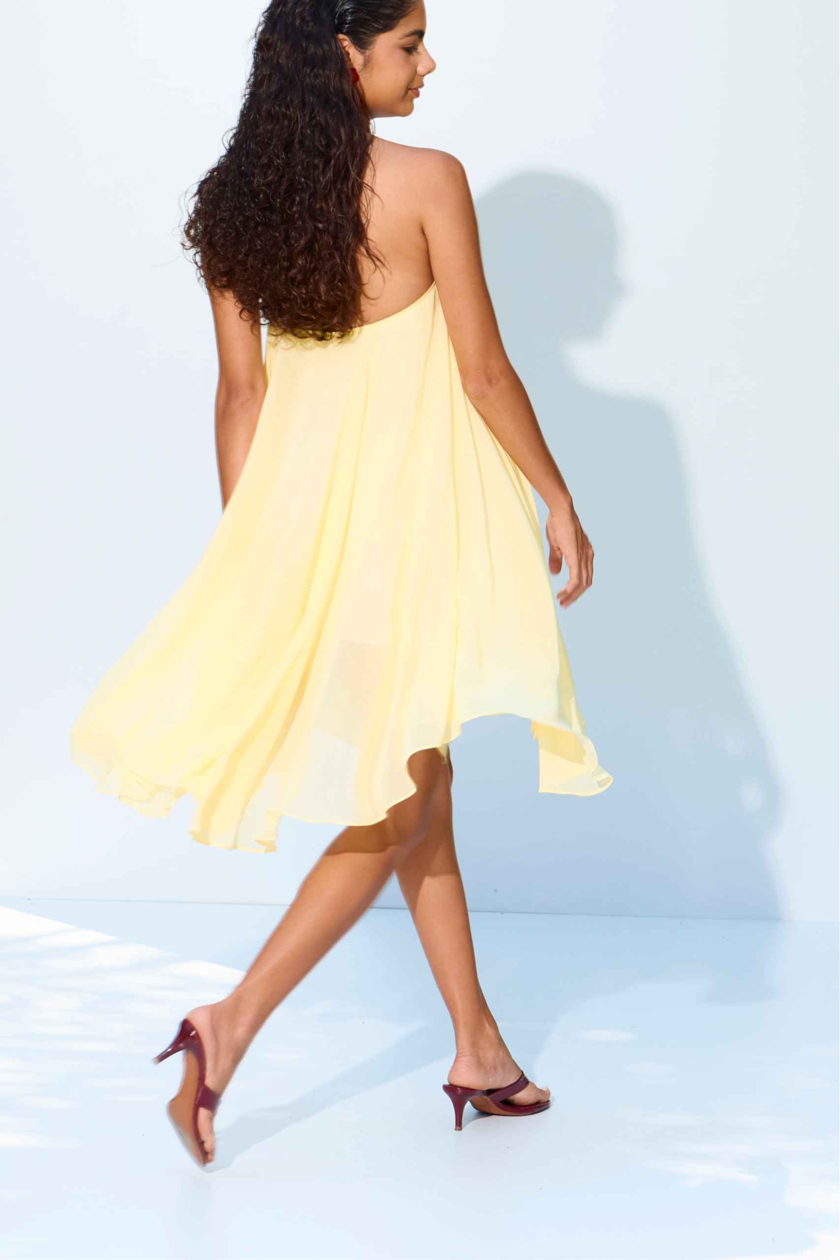 The fluff yellow dress captures the essence of sun-drenched escapes. Designed in a breezy lemon chiffon, this halter-neck silhouette flows effortlessly with every step. Its asymmetric hem and open back add playful elegance, perfect for seaside strolls or summer soirées.