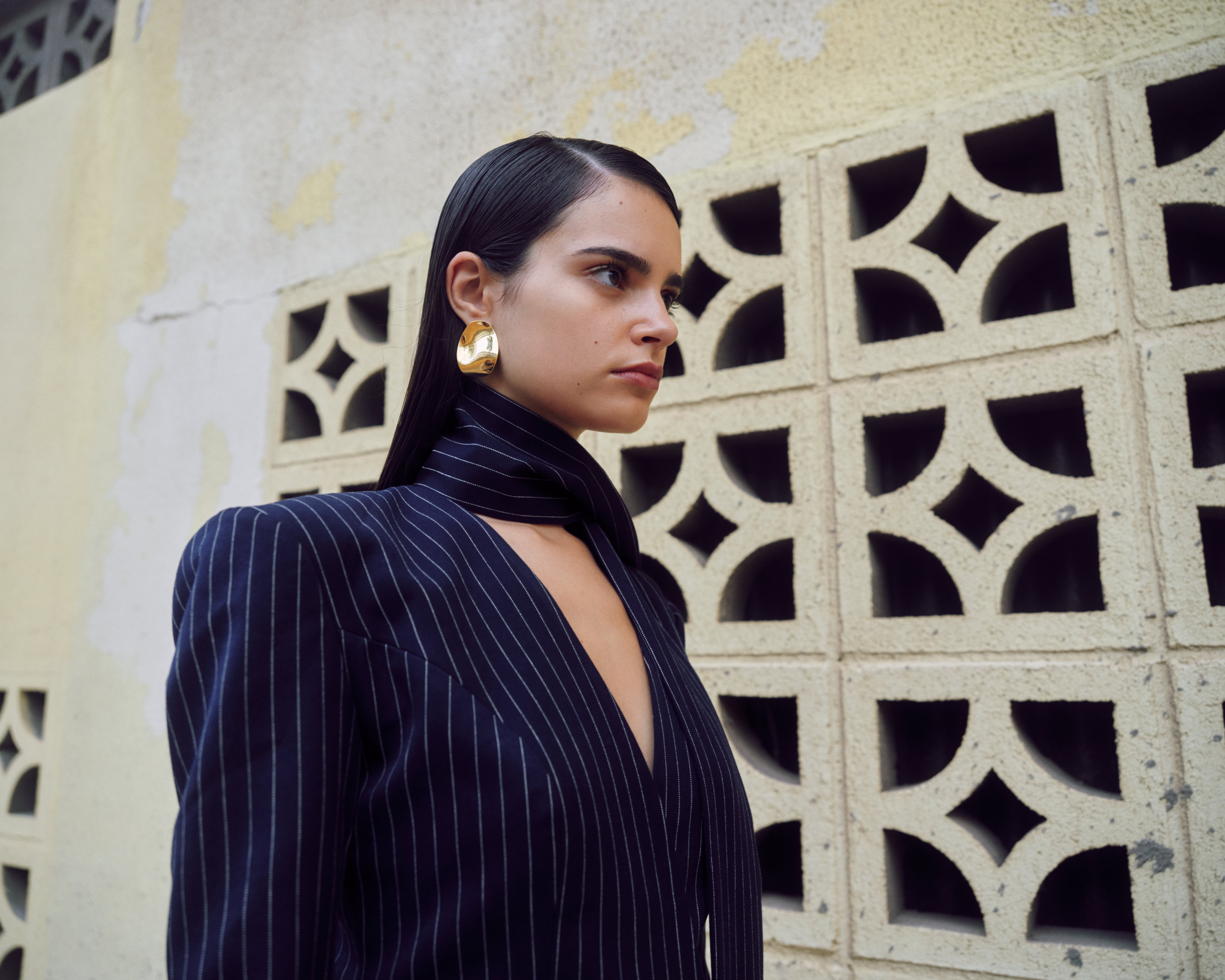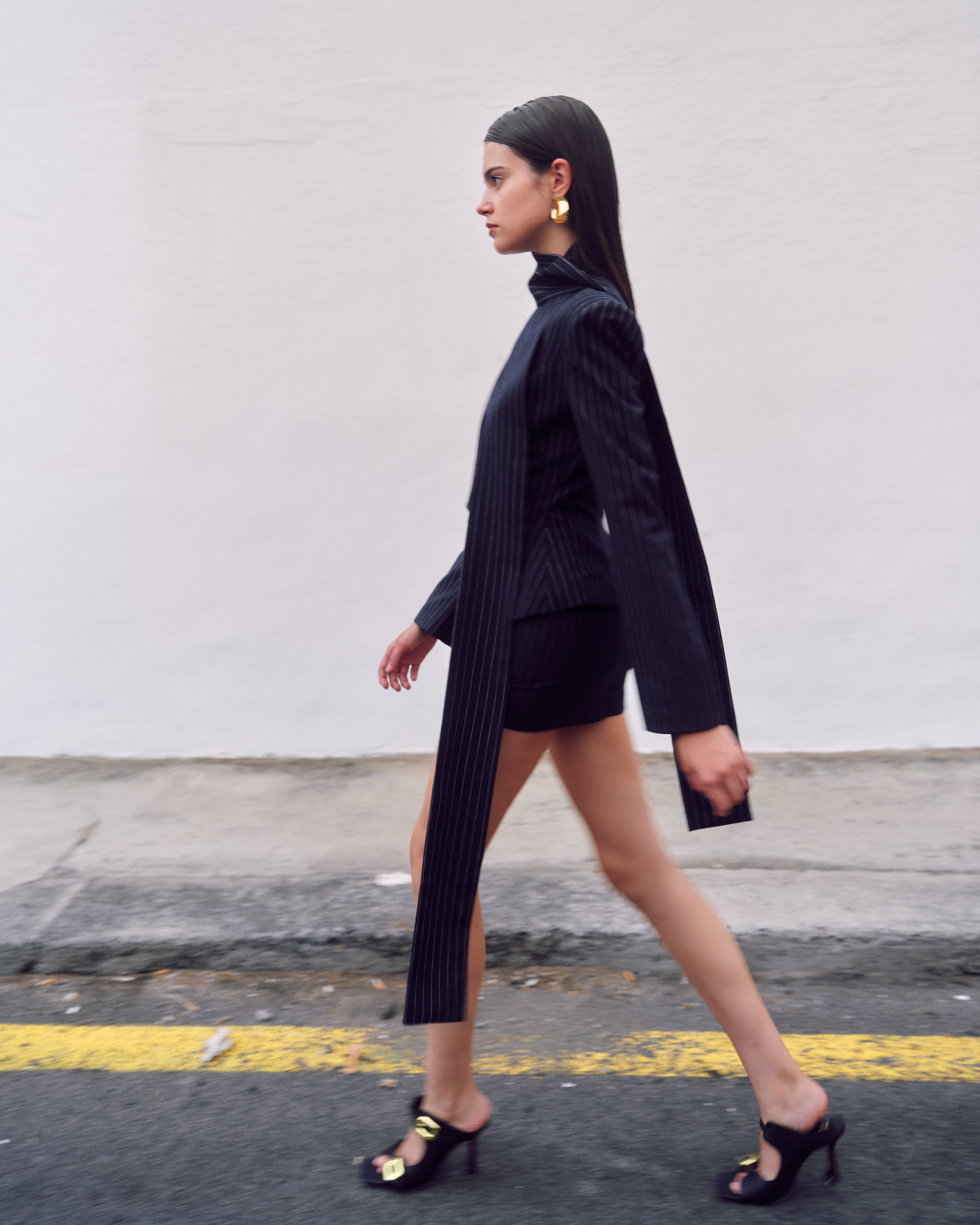 A tailored pinstripe suit featuring a sculpted blazer with an integrated scarf panel. Sharp lines meet an innovative wrap detail, paired with a mini skirt for a bold, fashion-forward silhouette.