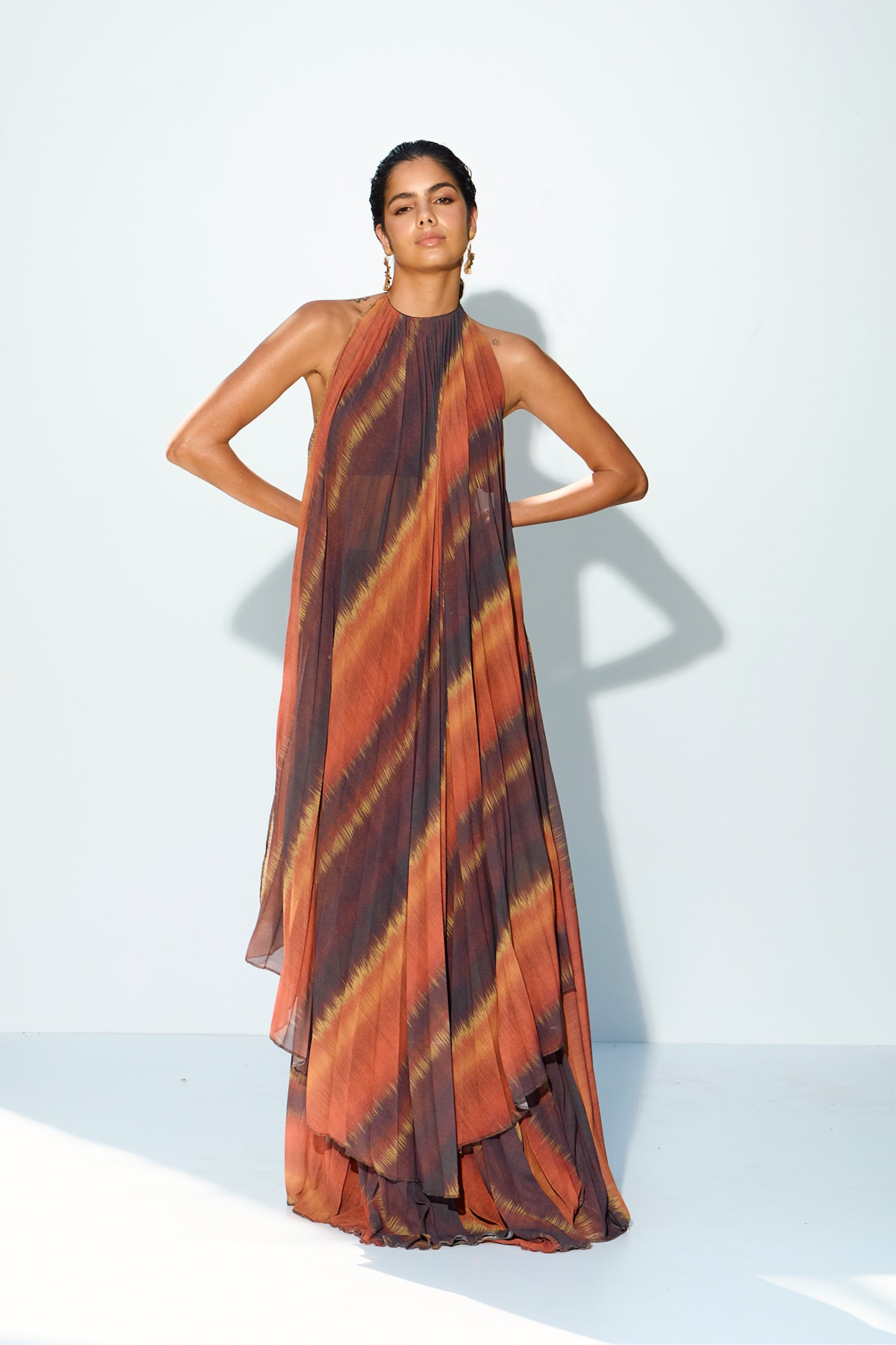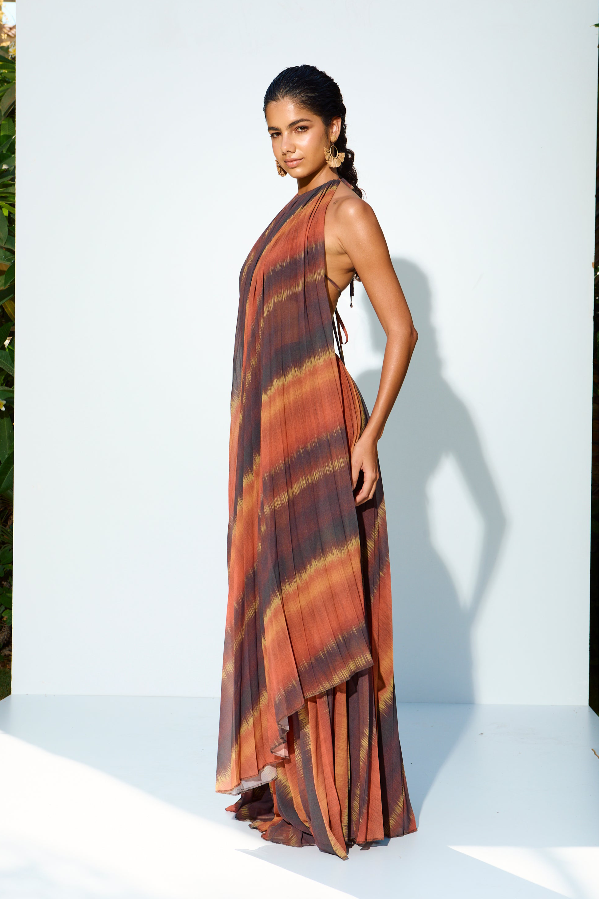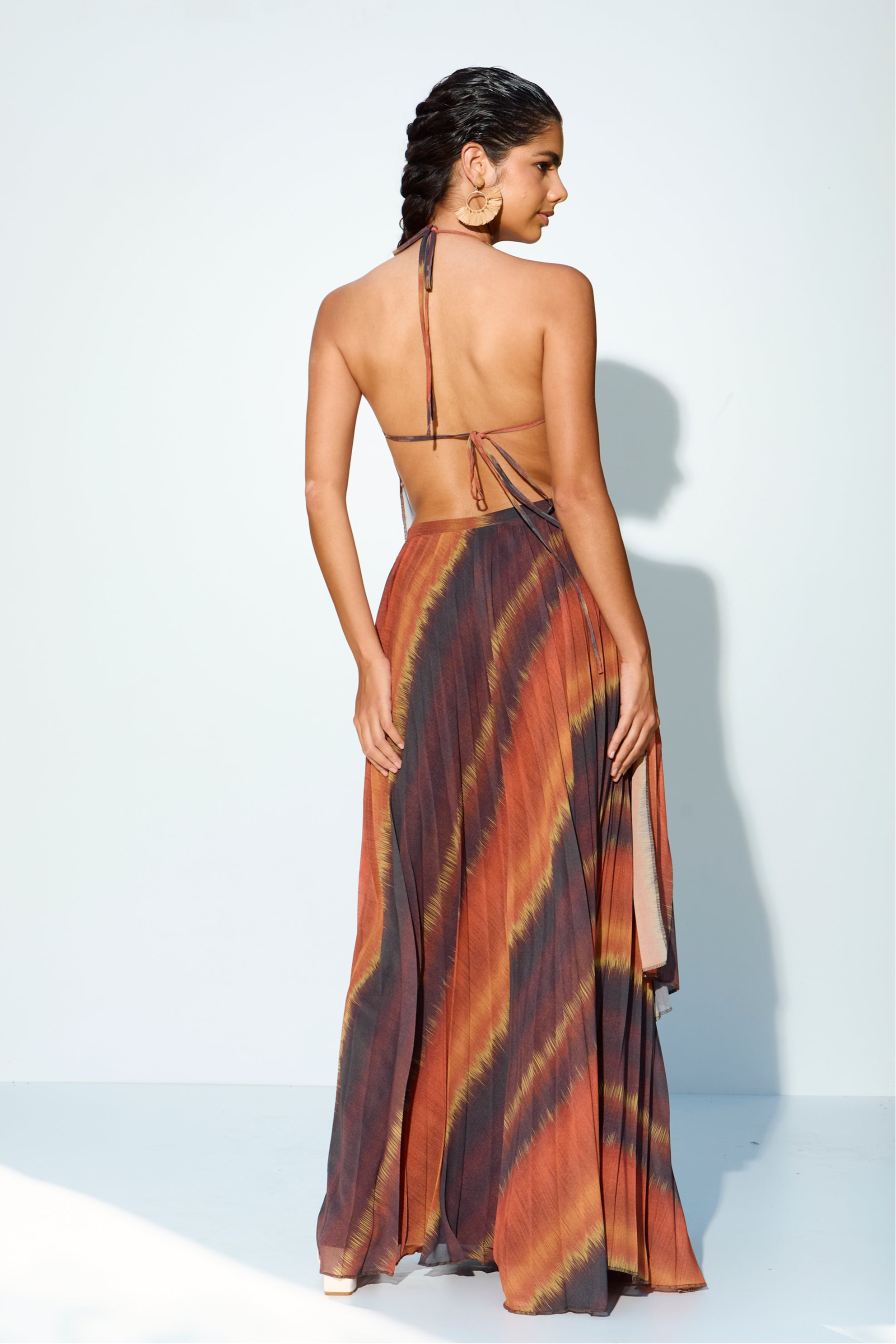 The Sunset Goddess Set includes a flowy top and matching skirt, designed for effortless elegance and movement. The top is completely backless, offering a bold, open silhouette, while the skirt features a side zipper for a secure fit—there is no elastic at the waist.