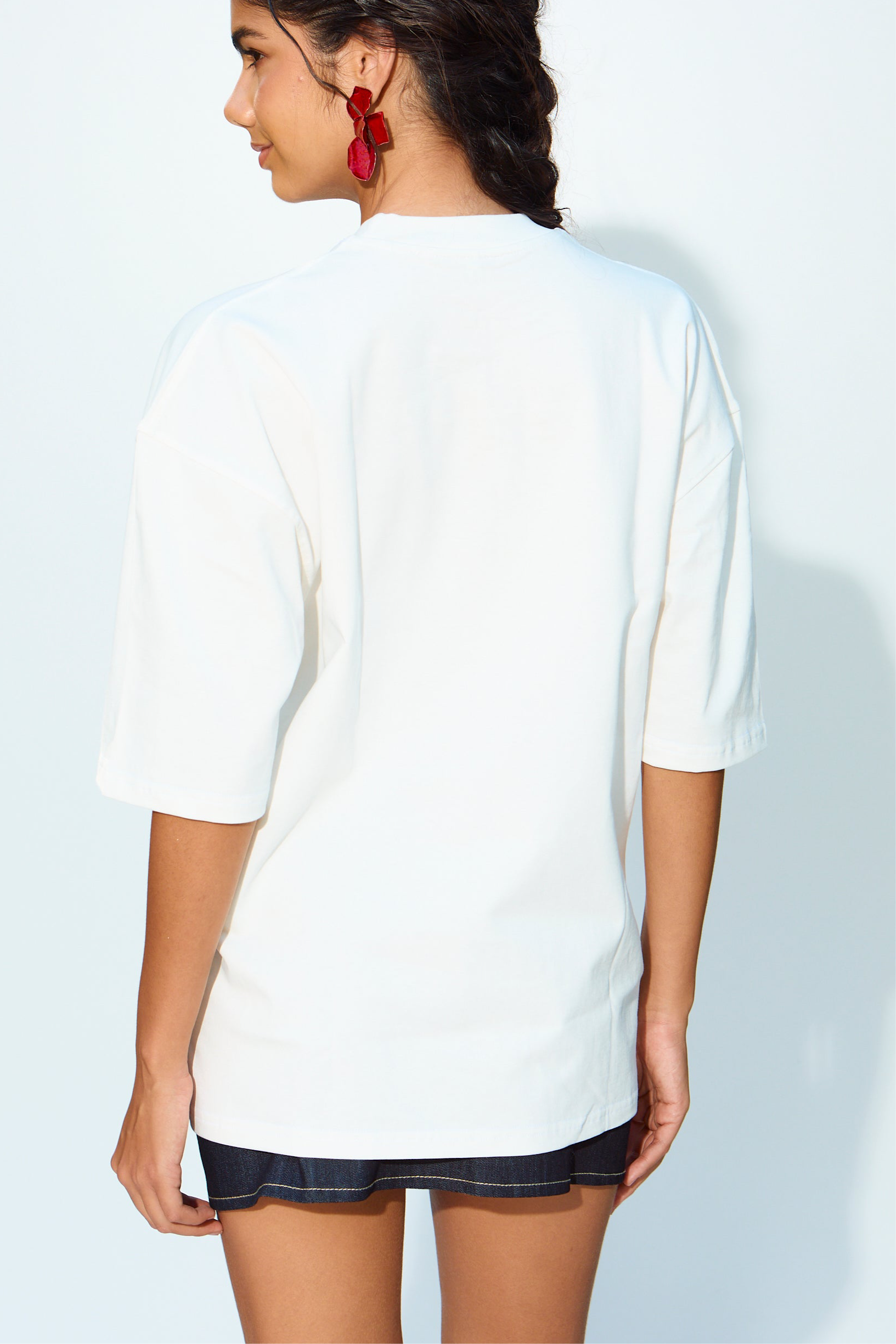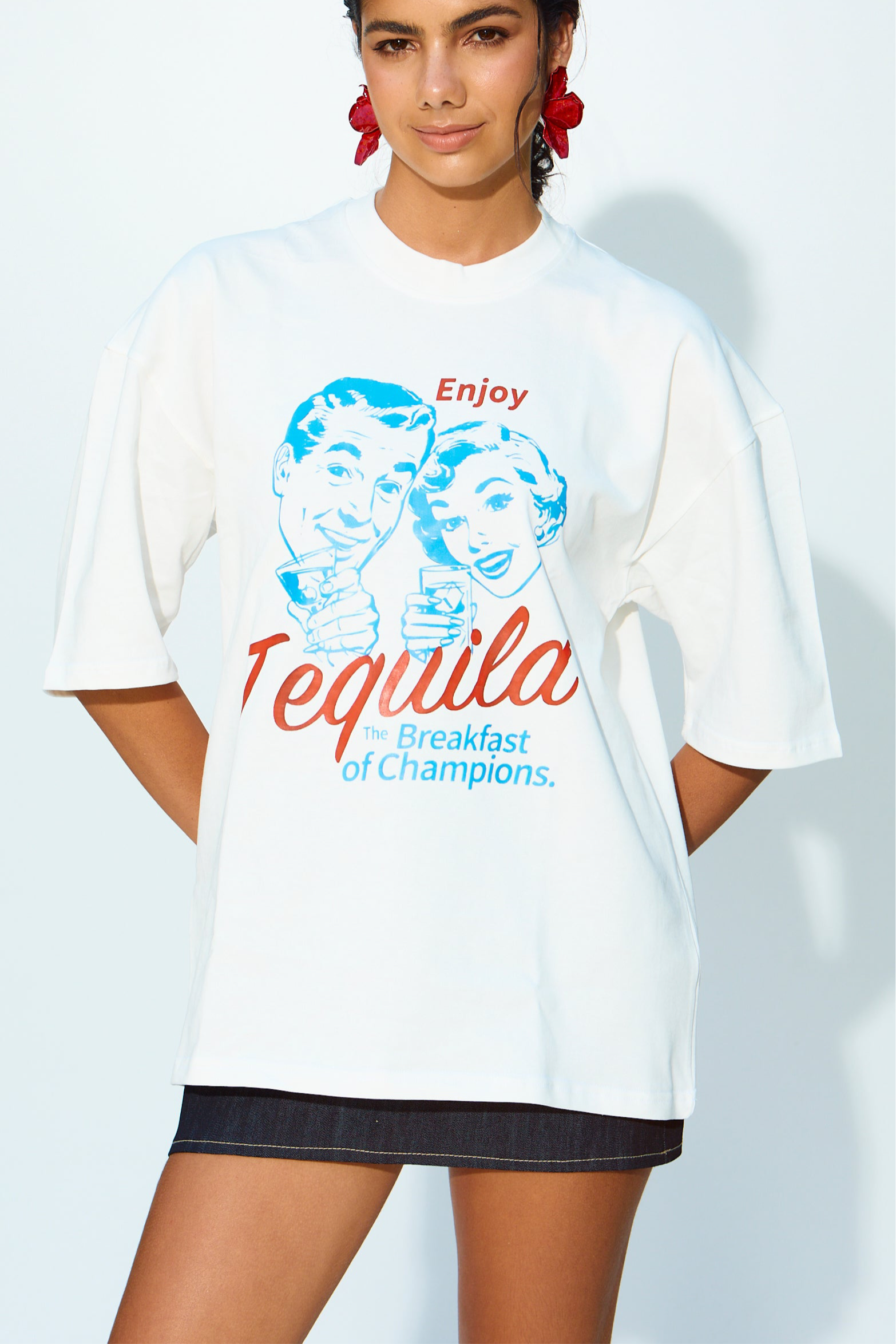 This oversized shirt features a white color and a bold "Enjoy Tequila, The Breakfast of champions" print