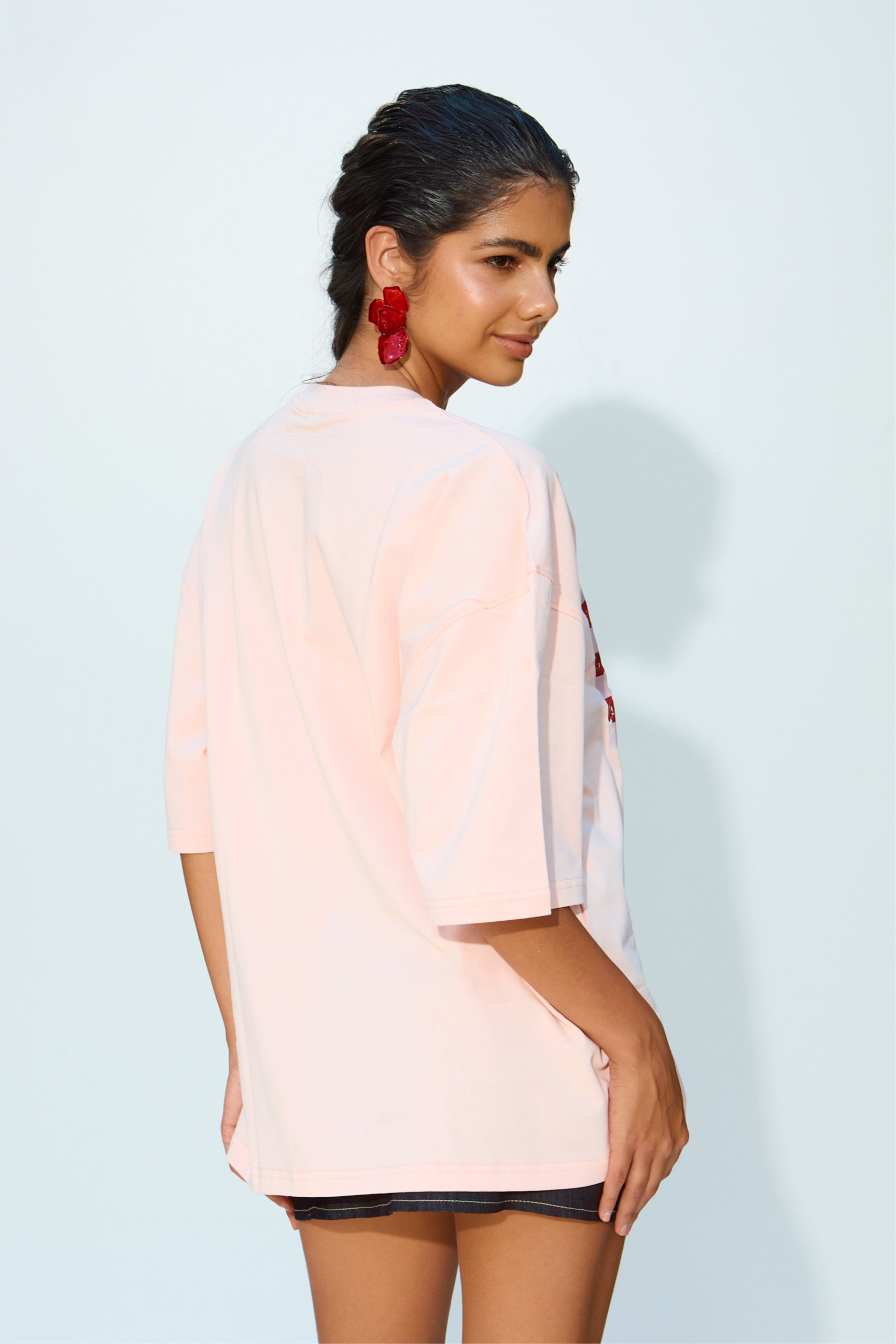 This oversized shirt features a stylish pink color and a bold "Welcome to the Tropics" print.