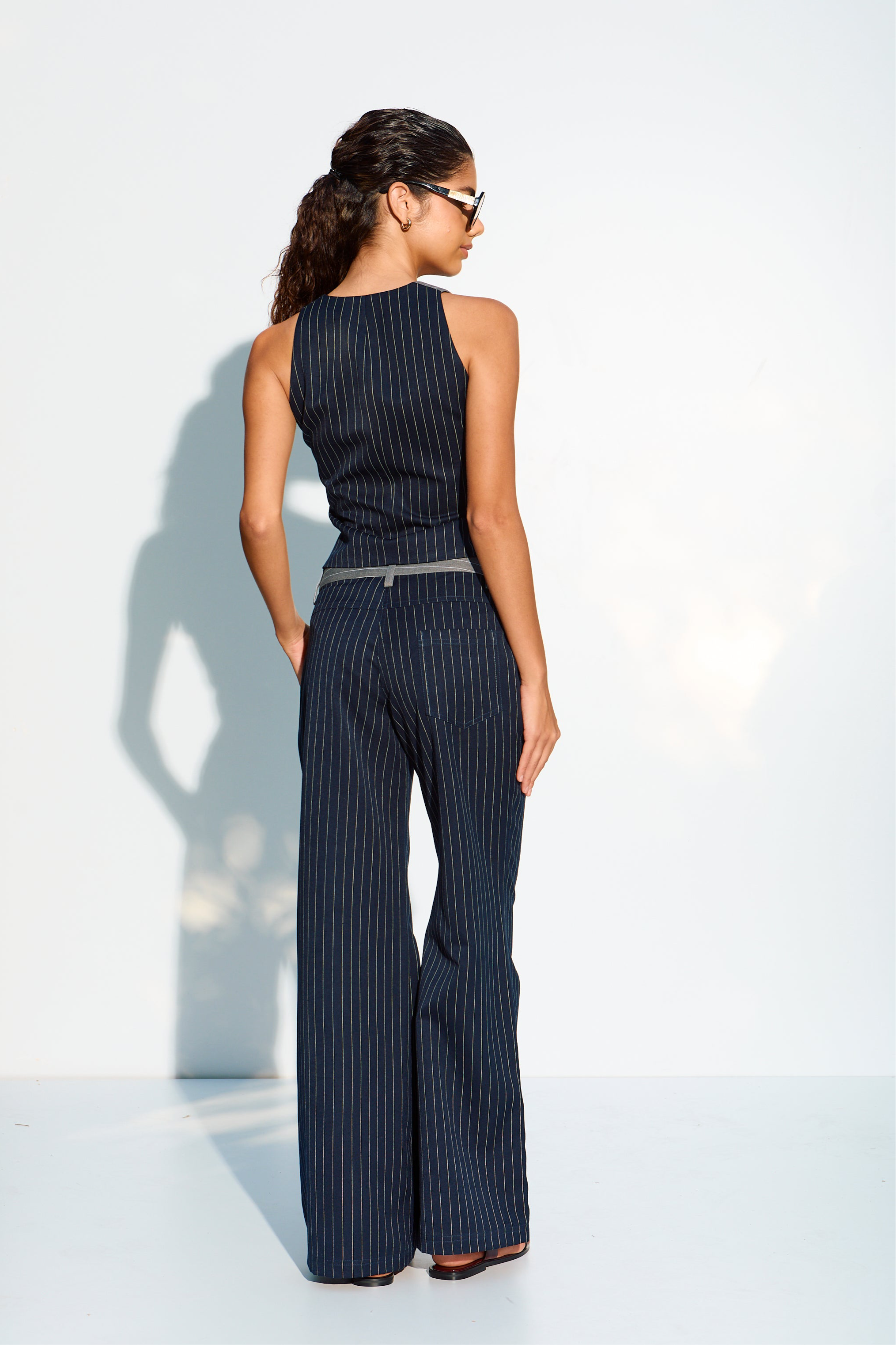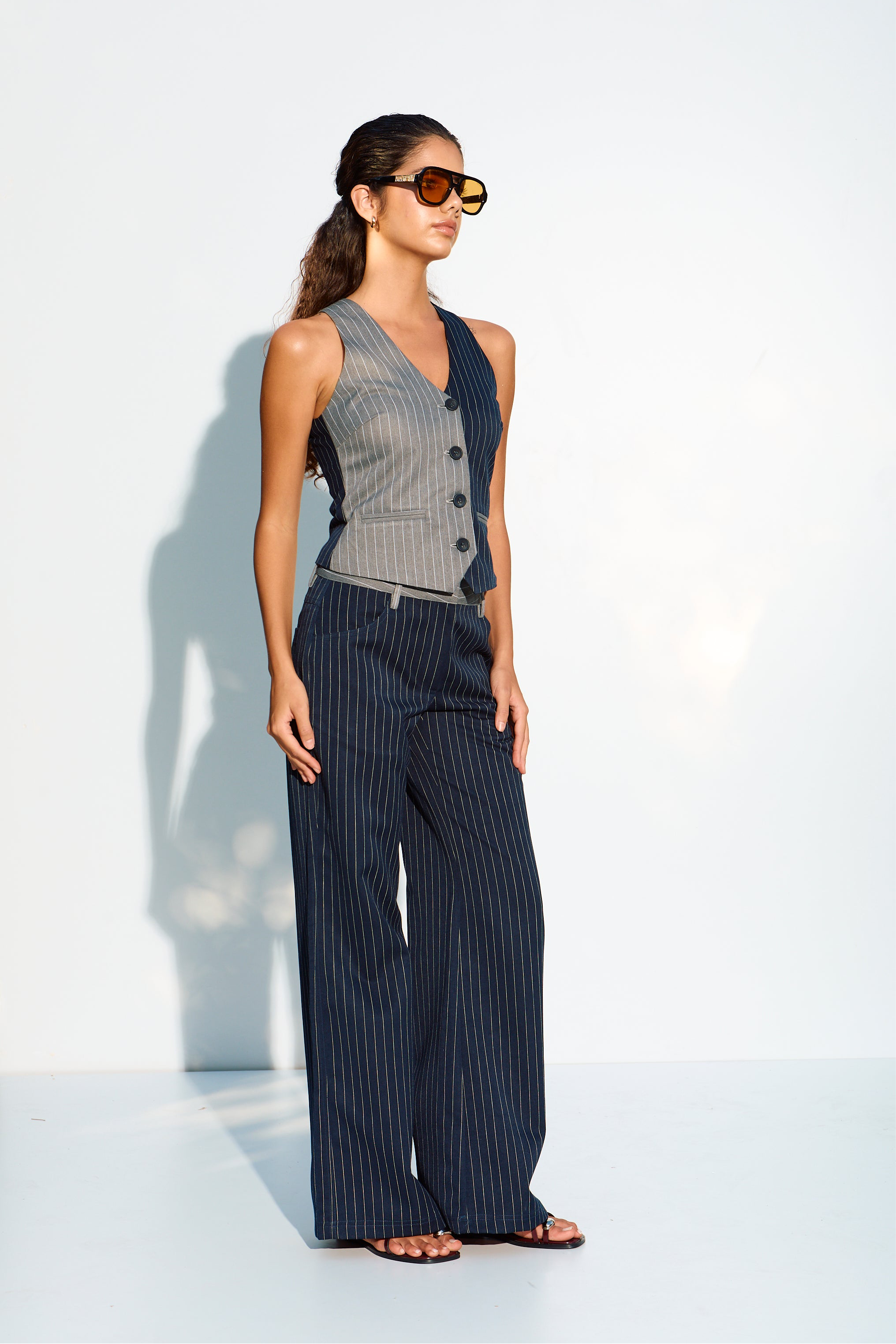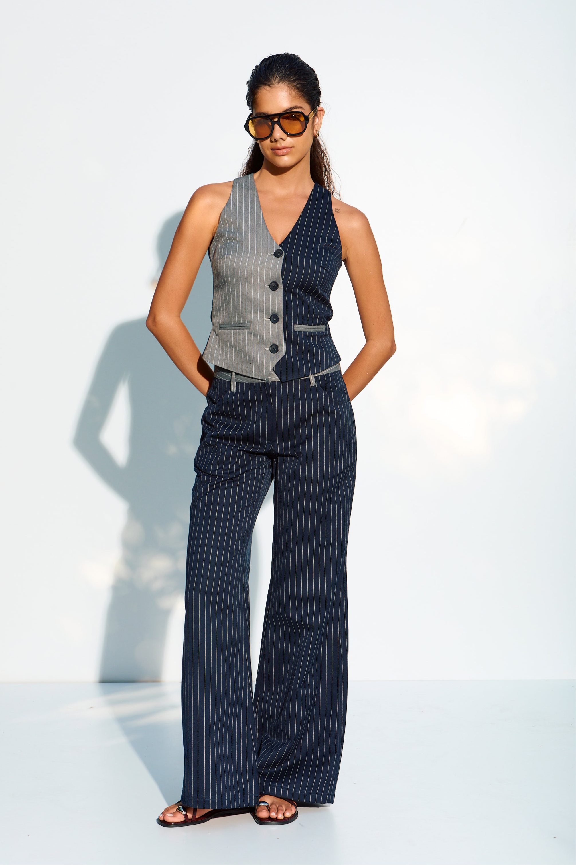 Redefine power dressing with Two-Tone Pinstripe Set, a tailored pinstripe suit featuring a unique two-tone vest and wide-leg trousers. This contemporary twist on classic tailoring is all about confidence and contrast—ideal for the modern woman who owns every room she walks into.